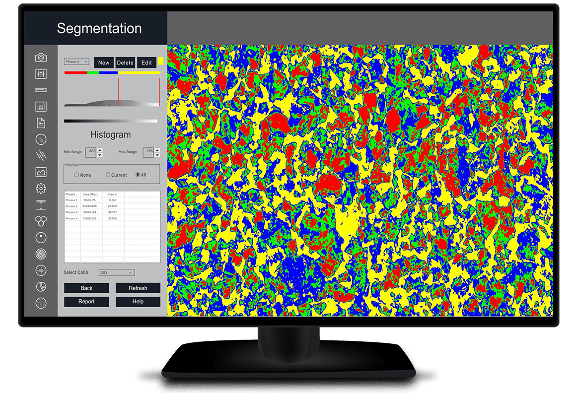 - Segmentation module in a sample measures the volume percentage of phases in a fully automatic way and is associated to a knew constitute of the specimen. Since a phase is detected and its area is estimated on the basis of its intensity/grayscale, an option for delineating phases from the histogram is also provided multiple phases are identified by colored overlays and can be simultaneously displayed for the same field of view. The area percentage data for each phase are displayed in class table. You can process and measures the unlimited number of images and all statistical data (area) will be accumulated in the class table.